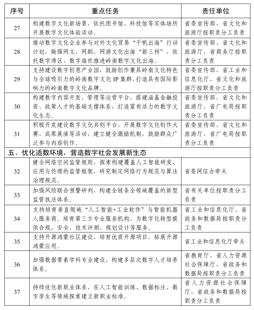 (十三)丰富数字文化资源供给。推进传统文化数字化,活化传承岭南文脉,推动岭南文化在数字化转型中实现创造性转化、创新性发展。建设岭南数字文化资源体系,大力实施“人工智能+文化”行动,推进实施文化数据库建设等系列文化数字化工程,促进文化与科技融合发展。
