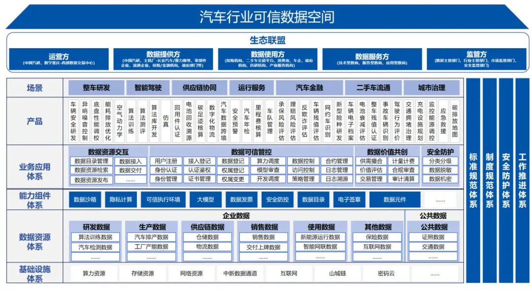为破解汽车产业在“研产供销服”全链条中存在的数据割裂、信任缺失与合规风险等痛点,中国汽研以场景需求为牵引,构建“四横四纵”可信数据空间总体架构。该架构以“四横”——基础设施、数据资源、能力组件、业务应用为主体,以“四纵”——标准规范、制度规则、安全防护、长效运营为支撑,形成覆盖技术、数据、规则、运营的全栈式体系。在实施层面,通过“设备层-架构层-算法层-应用层”四层技术栈保障数据流通全程可信可控,其中架构层融合联盟链、隐私计算与数字合约,算法层与应用层引入AI大模型与数据沙箱,实现数据“可用不可见、可控可追溯”。