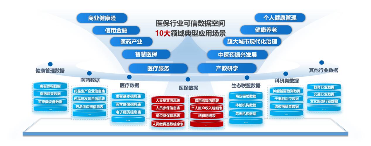 为了推进医保数据的融合应用与价值释放,医保行业可信数据空间围绕民生服务与产业发展需求,重点聚焦商业健康保险、金融服务、医药产业等重点领域开展探索。