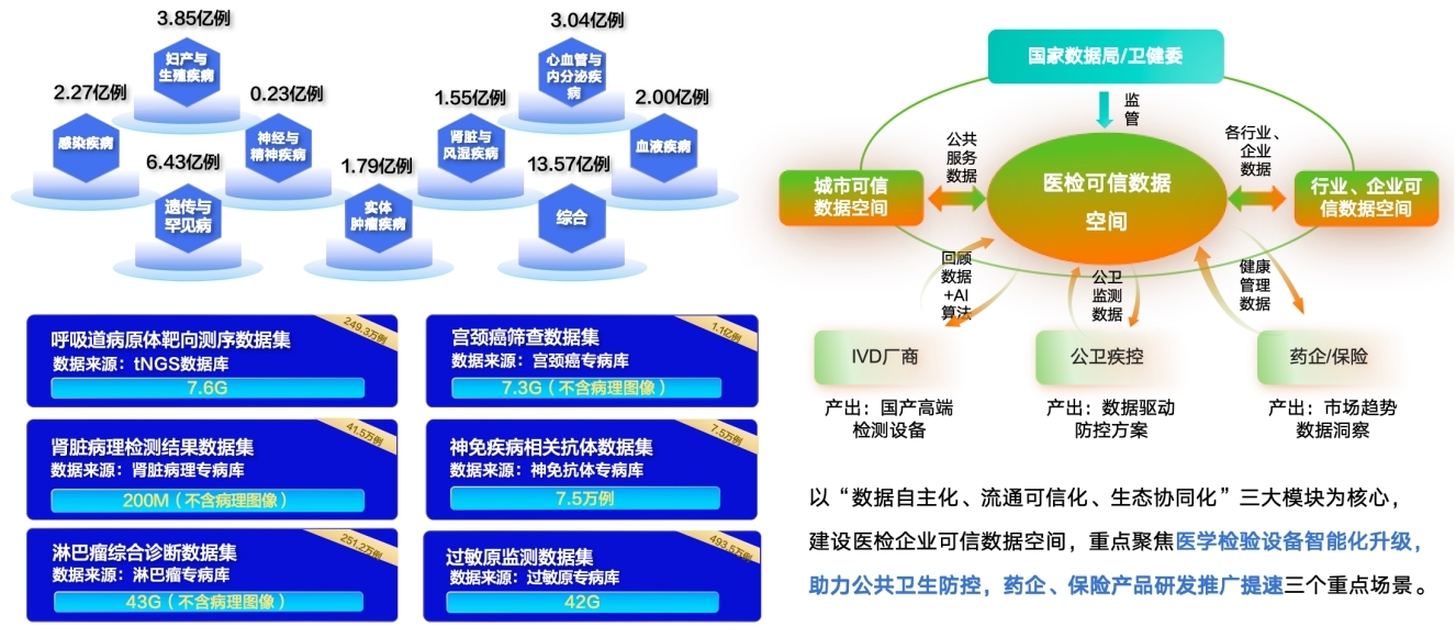 为解决医检数据分散、难以共享应用的难题,金域医学打造医学检验可信数据空间,整合“检测-临床-用药-随访”多模态多技术检验平台的医学数据,纳入基因组、病理影像等多模态的特色数据,目前已汇聚总量超23PB的医检数据,涵盖感染、肿瘤、遗传等重点疾病领域,形成东方人种医检数据池。通过可信数据空间向授权合作伙伴合规安全有序开放数据资源,打通实验室、试剂耗材、检测报告等核心数据流,提高产业链效率。目前已针对不同应用场景开放不少于30个高质量数据集,涵盖传染病监测、肿瘤精准诊疗等多个专业领域,为医检行业数据要素流通与应用奠定基础。