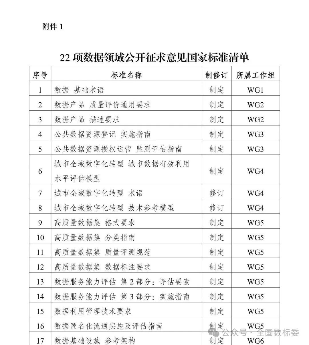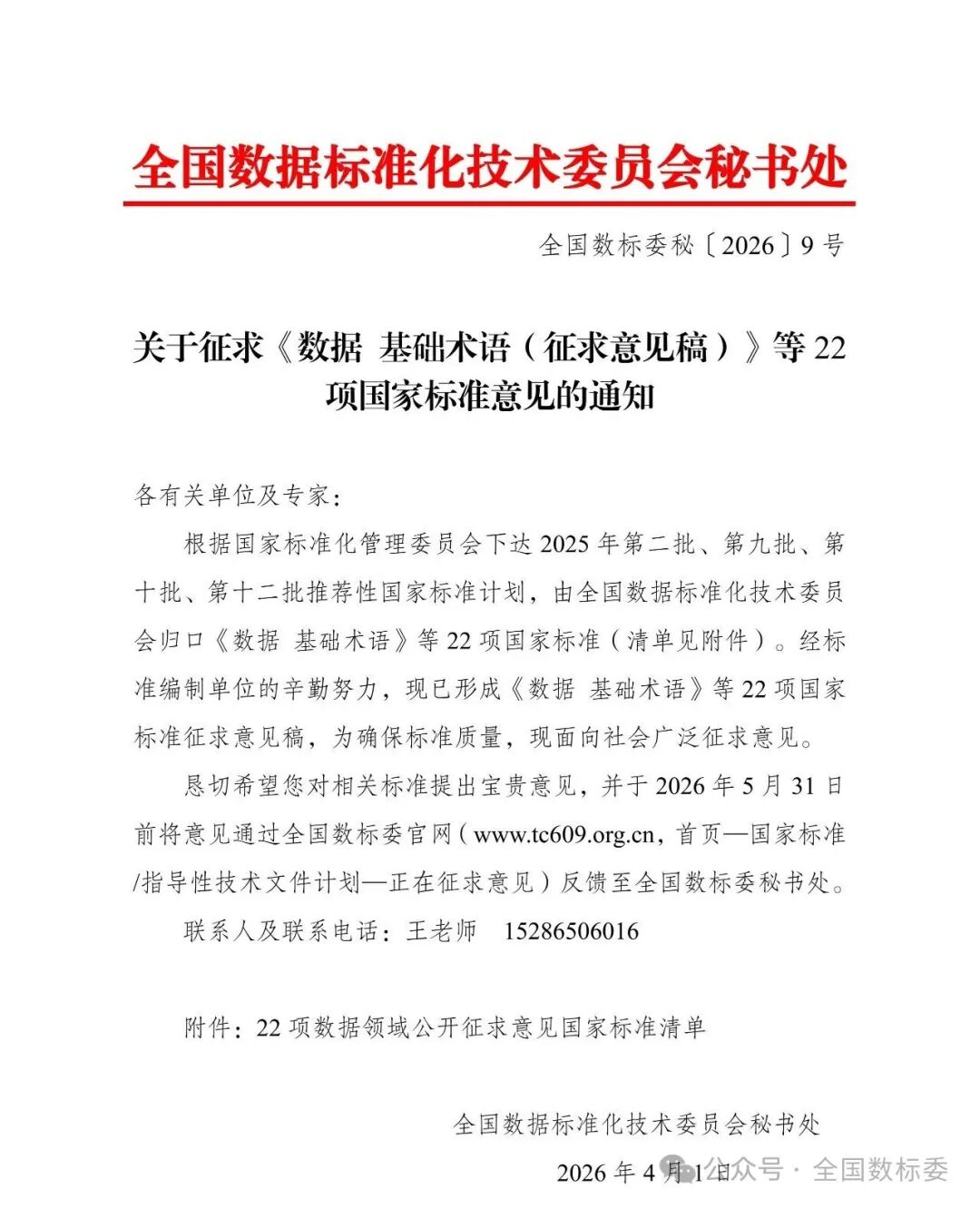 根据国家标准化管理委员会下达2025年第二批、第九批、第十批、第十二批推荐性国家标准计划,由全国数据标准化技术委员会归口《数据 基础术语》等22项国家标准(清单见附件1)。经标准编制单位的辛勤努力,现已形成《数据 基础术语》等22项国家标准征求意见稿,为确保标准质量,现面向社会广泛征求意见。