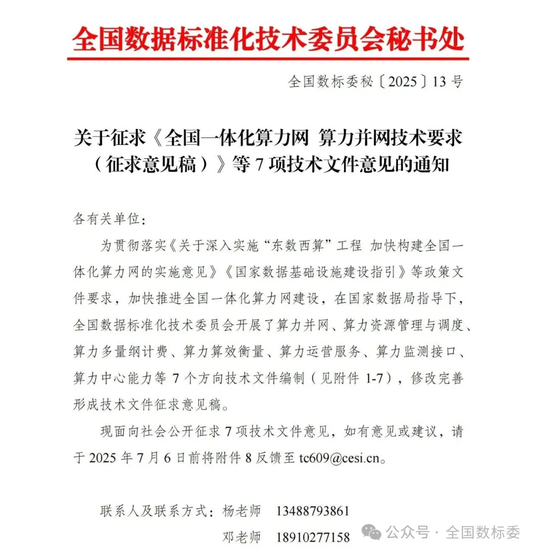 为贯彻落实《关于深入实施“东数西算”工程 加快构建全国一体化算力网的实施意见》《国家数据基础设施建设指引》等政策文件要求,加快推进全国一体化算力网建设,在国家数据局指导下,全国数据标准化技术委员会开展了算力并网、算力资源管理与调度、算力多量纲计费、算力算效衡量、算力运营服务、算力监测接口、算力中心能力等7个方向技术文件编制(见附件1-7),修改完善形成技术文件征求意见稿。