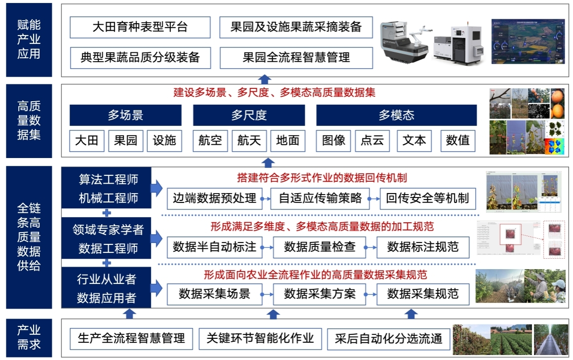二是面向科研、生产和作业三大板块,形成“算法研发-装备创制-平台搭建”的数据应用体系。面向科研,形成申请-授权使用机制,与需求单位形成协同创新格局;面向生产管理,以多模态数据为支撑,研发“感知-决策”系列模型,搭建智慧管理系统;面向作业,支撑采摘及分级两大类作业装备创制,有效节省劳动力10%以上。