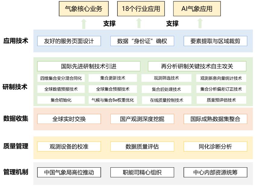 一是实现同化技术升级。引进四维集合变分混合同化技术,攻克多项关键技术,前20年卫星资料同化应用量增13%;构造流依赖Be矩阵提升同化效益,产品质量优于CRA-40和JRA-55等。
