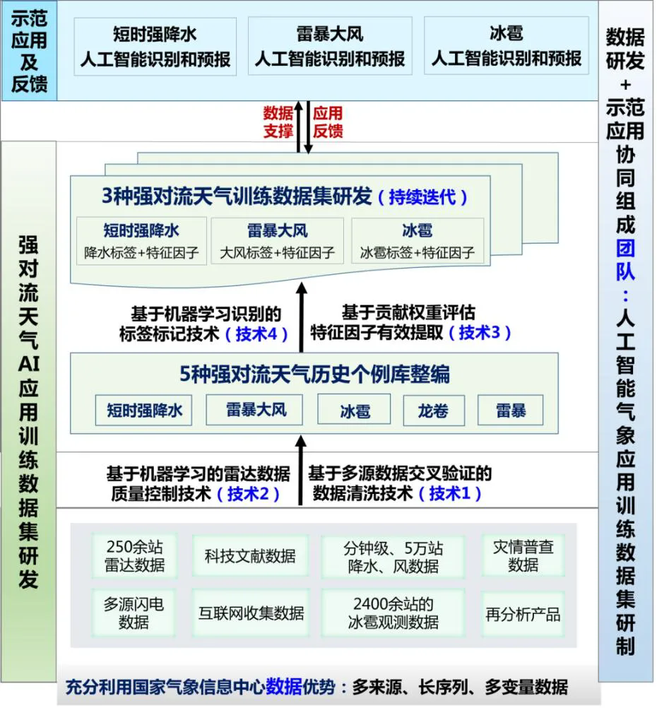 三是赋能应用,建立了“场景驱动—数据研发—模型研发—示范应用”的协同联动机制。依托项目合作、创新团队及工作组等方式,建立了“预报场景驱动—数据研发—模型研发—示范应用—反馈改进”的多领域协同发展模式,数据集有效赋能局地强对流天气智能预报及人工影响天气防雹作业等典型应用场景,支撑预报评分提升近10%。
