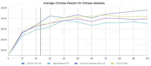 三是实施全方位安全与隐私过滤,保障数据集落地应用成效。通过融合正则表达式、命名实体识别与毒性分类器等技术,严格剔除隐私及不良内容,确保数据安全合规。基于此构建的CCI系列数据集已获52个国家和地区超600家机构使用,累计下载量达20万次。其中文子集CCI4.0-Zh-HQ在100B tokens训练规模下评测得分达33.57,较第二名高出1.16分,效果稳定超越其他开源中文数据集。