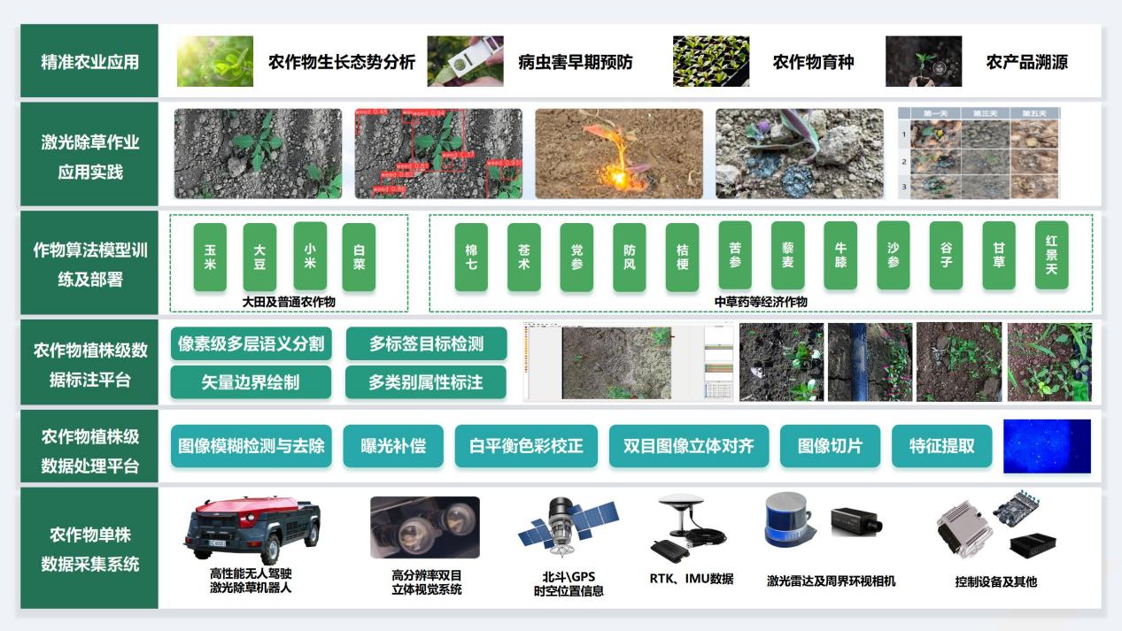二是驱动高精度激光物理除草技术落地应用。基于构建的高质量数据集训练AI模型,赋能激光除草机器人实现农作物与杂草的毫秒级精准识别以及毫米级精度的激光灼烧清除杂草,除草作业效率达到人工近40倍,单亩除草成本降低50%,验证了激光精准除草模式的巨大经济与生态效益。