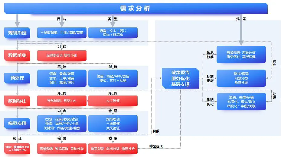 二是全生命周期的数据预处理标准。设定数据“完整性、准确性、一致性、及时性、安全性”等指标,搭建“加载-检测-去重-转换-缩放-编码-验证-导出”清洗链条,语音识别转化准确率97%、信息提取准确率92%、语义理解误差率≤5%、脱敏合规率100%。