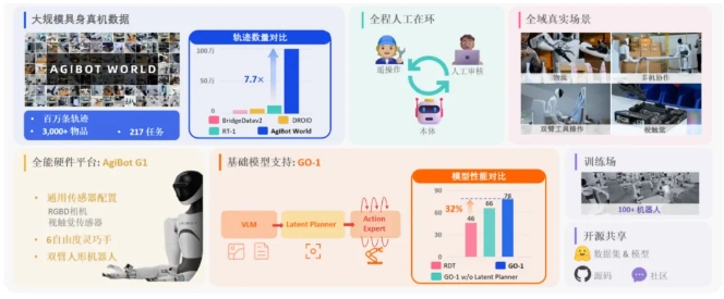 三是数据应用体系创新。项目构建“开源驱动-模型赋能-工具支撑-生态激活”四维一体的全链条应用体系,智元基于数据集发布具身基座大模型,可支持模型微调,赋能千行百业;发布全套工具链,实现采集、训练和评测完美闭环;同时举办AgiBot World Challenge开发者大赛,激发创新的无限潜能。