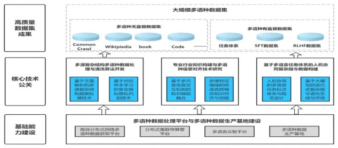 一是开展技术攻关,突破多语种数据瓶颈。针对多语种数据稀缺、处理复杂等问题,聚焦三大技术方向攻关:研发高效分布式多语种网络数据获取平台,实现互联网数据“应采尽采”,并构建分布式存算管平台,支撑大规模数据高效处理与存储;创新基于文图解析的多源异构多语种数据处理技术,通过数据清洗与质量提纯模型,实现复杂结构数据的结构化解析与精清洗;开发基于多语种对抗样本学习的安全隐私判别器,结合人机质检,确保多语种数据合规性。