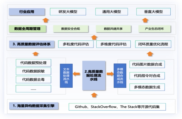 代码数据质量和动态利用方式,已成为大模型推理能力的“暗物质”,是推理基础设施的核心燃料,在软件工程等领域具有重要应用价值。针对当前代码数据来源广、质量参差不齐、评估手段专业化不足等问题,本案例构建了“数据采集-数据处理-数据质量评估”的高质量数据处理引擎,形成了一套高质量研发大模型数据集,并基于此数据集训练形成了具备代码补全、单元测试等能力的研发大模型,可支撑研发全流程赋能需求。