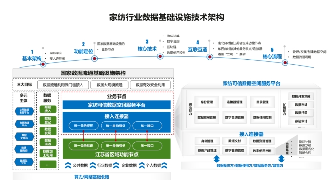 南通家纺可信数据空间以场景应用为驱动,打通数据流通堵点,融合多源数据实现高效开发利用,已成为激发创新、引领家纺乃至相关传统产业升级的关键数据基础设施。南通高新控股集团作为建设主体,打造面向家纺行业的数据基础设施,通过构建统一身份管理和资产确权体系,保障主体互信,形成可扩展的产业数据资源池。该空间遵循“身份、目录、标识”三统一核心标准,对接江苏省区域功能节点,推动家纺产业数据要素从分散管控向一体化服务跃迁。依托一体化数据开发平台,结合隐私计算、数据使用控制及区块链存证技术,空间运营平台提供数据市场运营与监督管理能力,建立覆盖数据全生命周期的安全防护体系,确保家纺行业优质数据“供得出、流得动、用得好、保安全”。