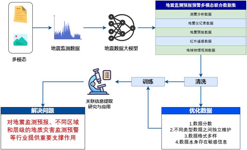 我国地震活动频发且致灾严重,用于地震监测预报预警数据源和产品种类较多,存在多源异构、时空分辨率不均、数据协议不统一、碎片化与敏感性并存等复杂问题,制约了人工智能技术在地震预测预警中的应用效能。我局以构建覆盖测震、地球物理、遥感等多模态数据的标准化联合数据集为目标,突破多源异构数据融合、深度学习模型构建、轻量化边缘计算等关键技术,解决数据分散存储、格式不统一等挑战,支撑地震大模型训练与多灾种实时预警技术突破。