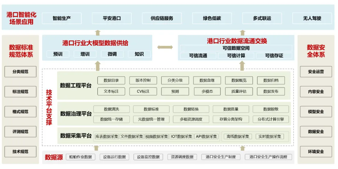 三是构建港口行业全链数据标准体系。基于港口高质量数据集建设成果,规划“国家战略响应→全链标准构建→实践迭代验证”路径,作为国家信标委港口工作组组长单位,依托人工智能基地,通过“体系化建标+场景化验标”,开展15项人工智能标准建设,为港口行业数据集标准化提供可参照的“青岛样本”。