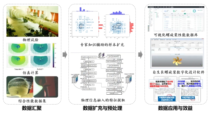 二是物理信息融入的数据特征提取技术。针对螺旋桨几何高维参数在智能建模上复杂度高的问题,引入物理信息融入的特征提取神经网络和集成学习算法,实现性能预测误差<5%,效率较传统方法提升100倍。