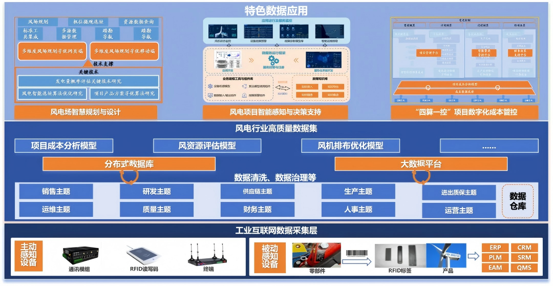 二是创新技术突破构筑核心应用能力。建立风电三大核心应用,风电机组诊断微服务应用融合SCADA与多源振动数据,通过特征提取与深度神经网络开发50余个模型,实现故障精准预警;风电场智慧规划与设计应用基于遗传算法、粒子群优化等模型,支持多目标自动优化机位布局,三维可视化输出方案,缩短设计;风电项目感知及决策支持集成物联与业务系统数据,强化供应链协同与项目穿透式管理,提升运维及产业链效率。
