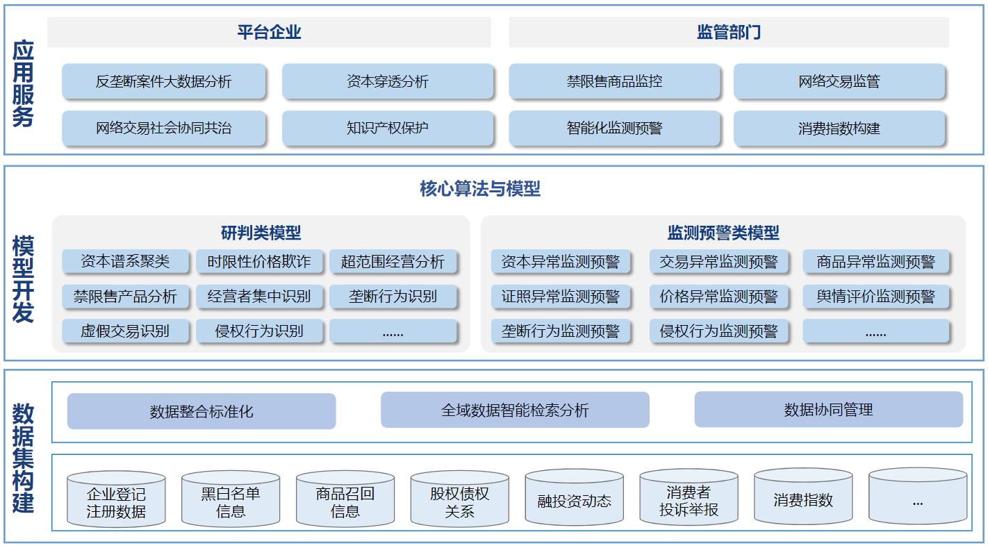 二是构建智能监管服务一体化平台。利用研判模型和监测预警模型充分挖掘数据价值,针对反垄断大数据分析、资本穿透分析、网络交易社会协同共治等业务场景,充分利用数字资源,开发10余类业务系统,连接市场监管部门和平台企业,助力常态化监管和服务。