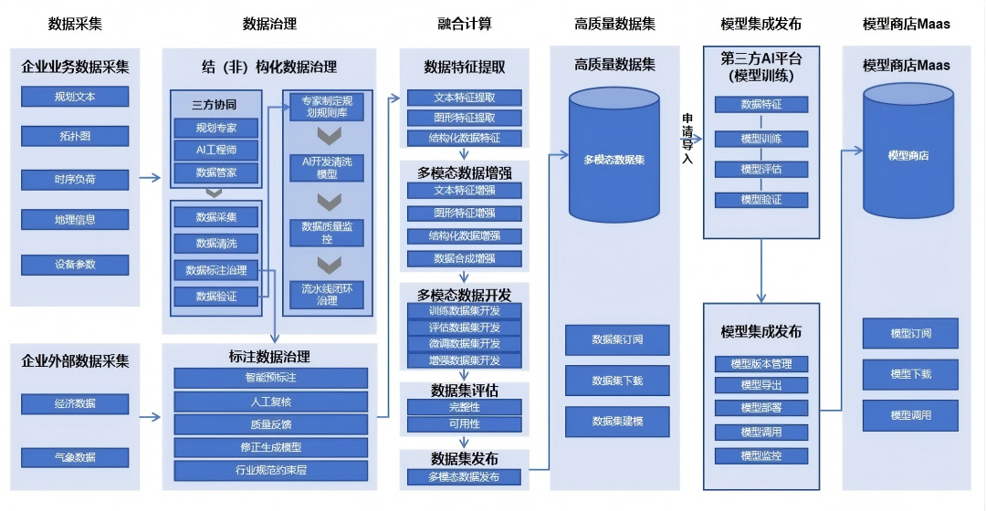 针对配电网规划依赖人工作业、数据壁垒严重、多模态数据协同困难等问题,本案例建立了“标准-技术-流程”三位一体数据集治理体系。通过整合规划文本、拓扑图、时序负荷等7类异构数据,构建了覆盖配电网规划业务全流程的多模态高质量数据集,有效支撑配电网规划大、小模型研发,显著提升南方五省区电网运行安全性、韧性与智能化水平。