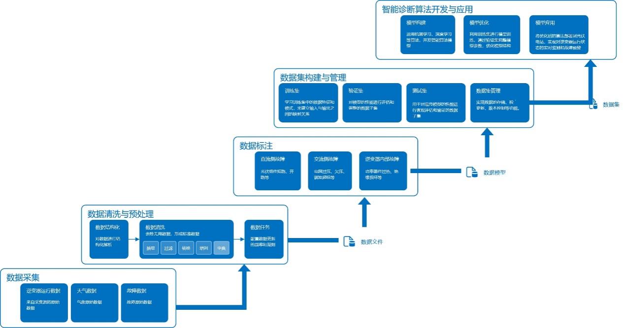 一是遵循一套严谨的系统化流程。首先通过在多个大型光伏电站部署传感器网络,广泛采集逆变器的多维度实时运行数据、设备信息及环境数据。然后对海量原始数据进行专业的清洗、预处理与标准化,组建专家团队对数据进行精细化的故障类型标注,并把处理后的数据构建成结构化的训练集、验证集与测试集。最后利用深度学习算法开发智能诊断模型,部署于电站监控系统中,实现实时监测与故障预警。