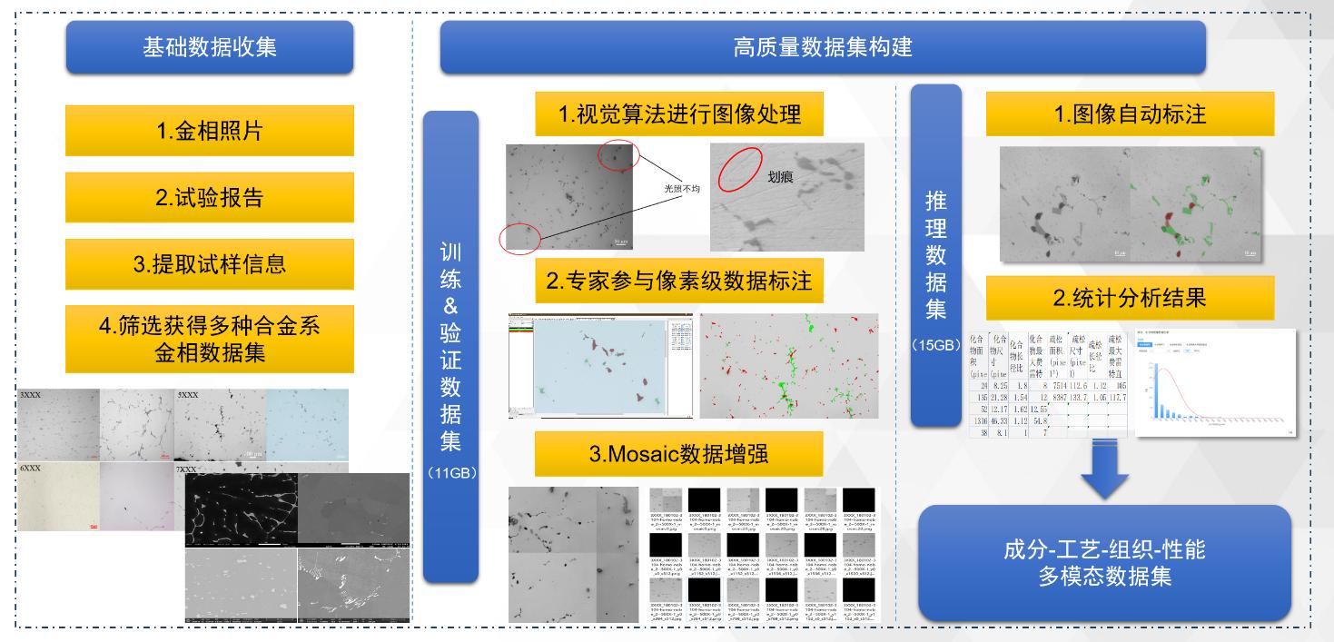 微观组织决定金属材料的关键性能,其精确的定量表征数据是构建“成分-工艺-组织-性能”模型的基础。针对传统二值化方法易误判、一致性差,数据积累不足而制约AI模型开发的现状,构建铝合金材料金相组织图片数据集。包含11GB专家标注金相图片,支撑高精度AI模型开发。通过平台统一管理,年底将沉淀15GB推理数据,赋能材料研发。