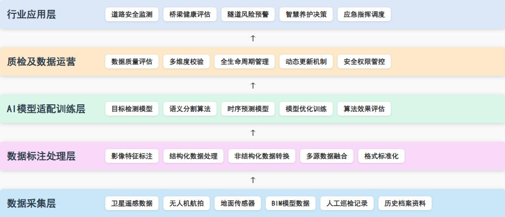 我国交通基础设施建设规模持续扩大、服役年限增长,交通基础设施产生遥感影像、传感器时序等海量多源异构数据,针对原始数据质量参差不齐、标注效率低下、语义信息缺失等问题,本案例构建“数据采集-标注处理-AI模型适配-质检运维”“五位一体”技术体系,通过多源数据融合、智能标注、算法训练、全流程质控等关键技术,形成覆盖全生命周期的交通基础设施安全监测数据集。可支撑训练出系列前沿AI模型,实现设施病害自动化识别、风险动态预警等功能,显著提升监测效率与决策科学性。
