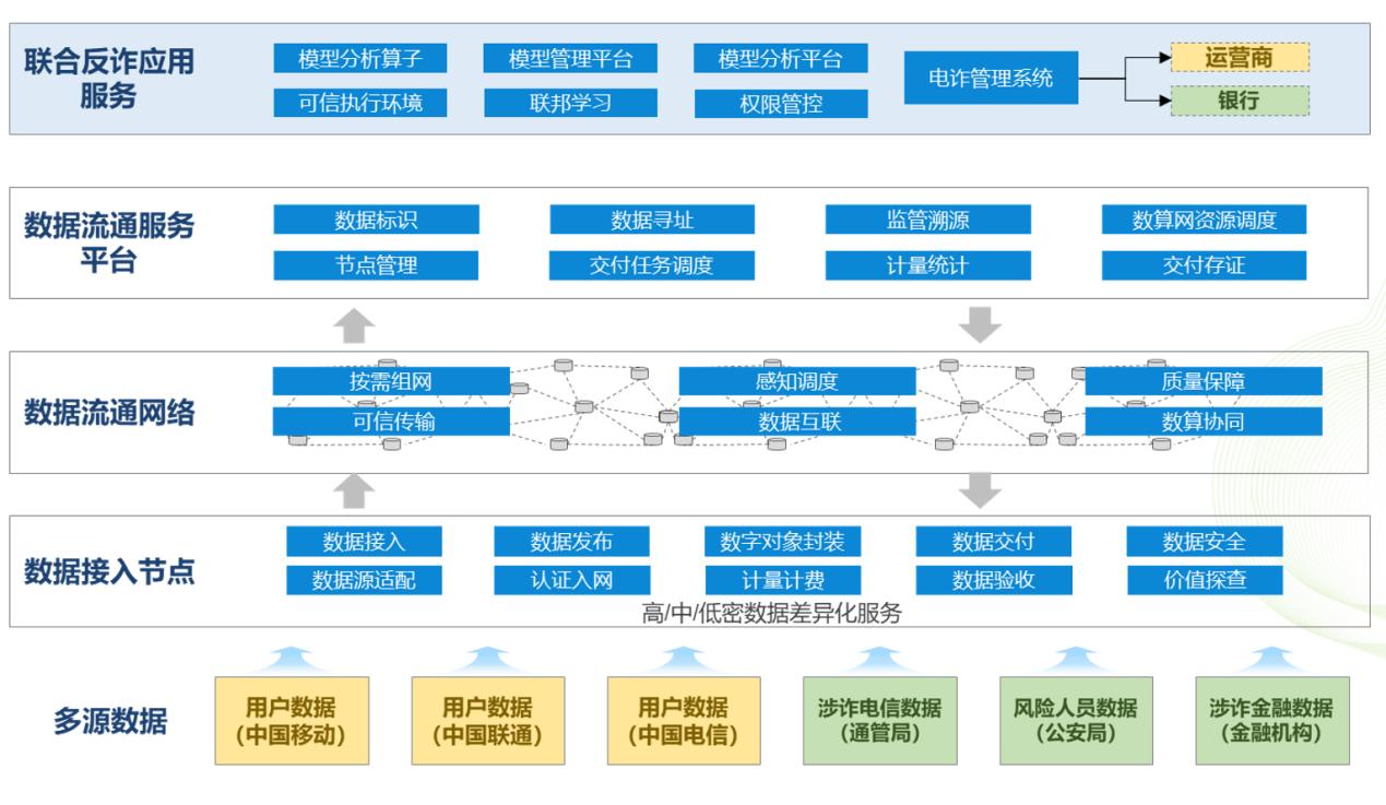 中国移动联合北京大学、大数据分析系统国家工程研究中心、西安交通大学、广东移动、天津移动、四川移动、启明星辰、亚信科技、洞见科技、数牍科技等单位,遵循国家数据基础设施建设指引,开展国家数据基础设施先行先试,紧扣国家数据局“三统一”部署,采用“接入节点-流通网络-服务平台”三级架构,通过数字对象封装与全域标识技术、高速数据加密传输网络技术、隐私保护计算与数据使用控制等技术,支持高、中、低安全要求的数据进行差异化处理,构建“数联网”基础设施,提供一点接入、广泛连接、标准交付、安全可信、合规监管、开放兼容的数据流通服务。基于数联网数据基础设施,实现运营商、工信、银行、公安等40余家机构间异构数据的标准化接入与安全流通。涉电信网络诈骗用户识别准确率整体提升21%。