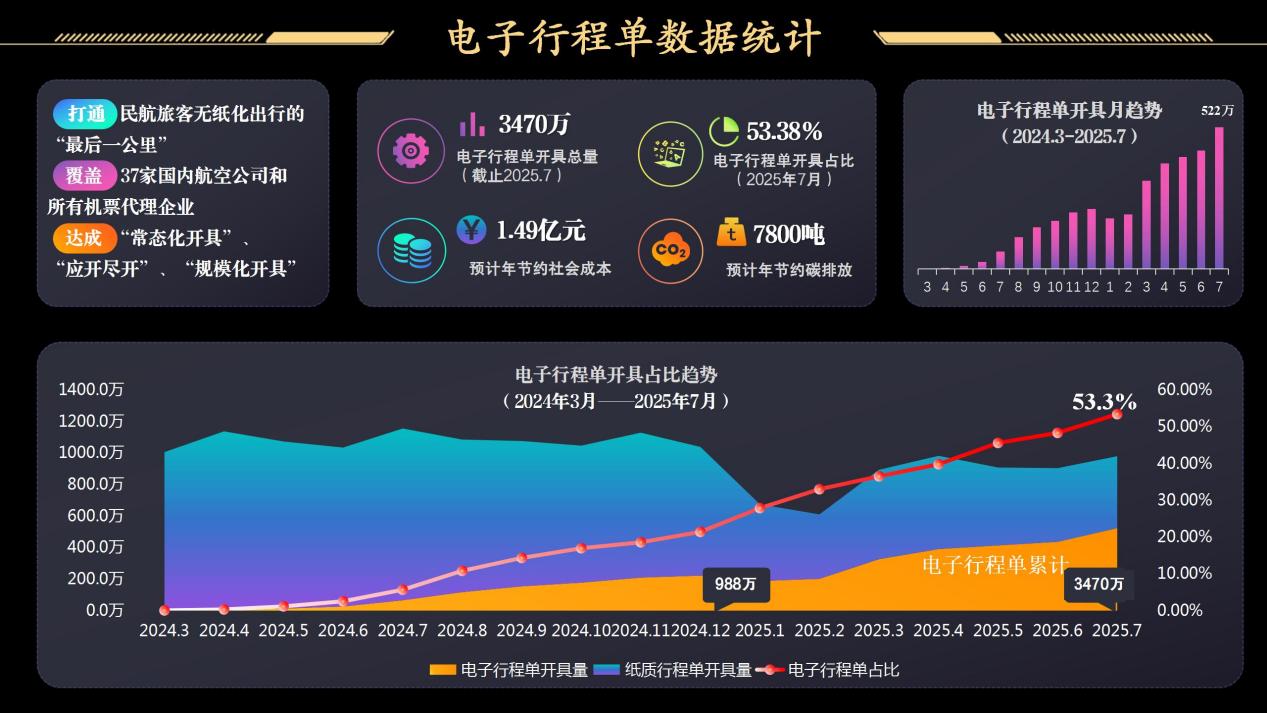 中国航信电子行程单开具分发系统打通民航局、税务总局、航司、企业及旅客数据链,推动行程单全流程电子化。系统汇聚航班、旅客、票价数据,融合销售方与购票方信息,采用SM2加密传输、多票种防重机制,依托数字签名构建防伪核心,结合OFD版式文件打造标准化交付载体,经税务总局验证后交付,实现报销凭证开具、交付全环节电子化,提升效率与安全性。实现国内37家航空公司及所有民航代理企业的全覆盖,累计开具超3000万张,成功达成电子行程单业务“常态化开具”、“应开尽开”、“规模化开具”目标。系统打通了民航旅客无纸化出行的“最后一公里”,预计年节约社会成本1.49亿元,年节约碳排7800吨。