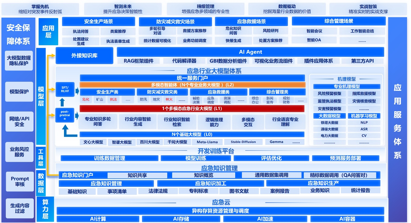 一是构建国内首个私有化部署的行业大模型。应急管理“久安”大模型采用监督性微调、OP-RAG优化、智能体规划与协同优化、多模态路由大模型等关键技术,构建了自主研发的应急管理行业大模型底座,实现了国产软硬件的深度整合与行业专属定制化应用,赋能应急管理行业智能高效升级。